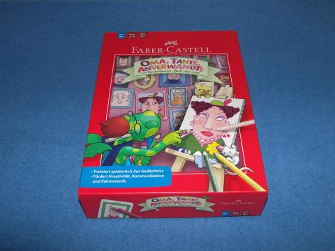 Auf 36 Portraits sind die Mitglieder von vier Familien verewigt. Jeder bekommt eine Blatt Papier und eine Portrait-Karte, diese wird auf Kommando umgedreht und angeschaut. Dann legen alle die Portrait-Karten wieder verdeckt ab und malen das Gesicht mit den Schablonen nach und schreiben den Namen dazu. Danach gibt es Punkte für jede richtig genutzte Form und Farbe. Wer am meisten Punkte hat, gewinnt. Ko-Produktion mit Faber-Castell, © Faber-Castell, Vertrieb Hutter Trade.
