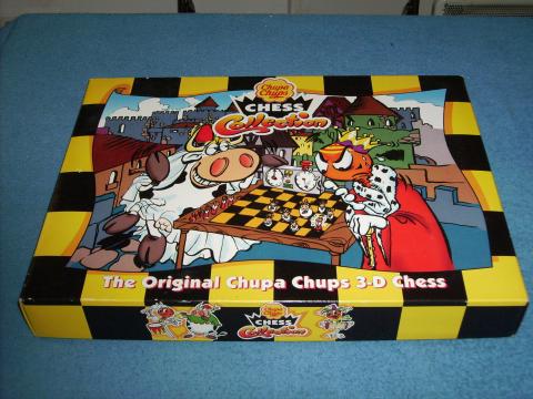 The Original Chupa Chups 3-D Chess Schachset mit Chupa Chups Motiven, König, Springer, Turm und Bauern mit Menschenköpfen, Dame und LÄufer mit Kuh-Köpfen, die Springer sitzen auf Kühen Ludografische Angaben Verlage: S.A. Chupa Chups Inventarnummer: 19597 Kategorien: Setz-/Position, Werbe, Abstraktes Spiel Spieler 2 - 2 Spieler Alter 6 - 99 Jahren Dauer bis 45 Minuten