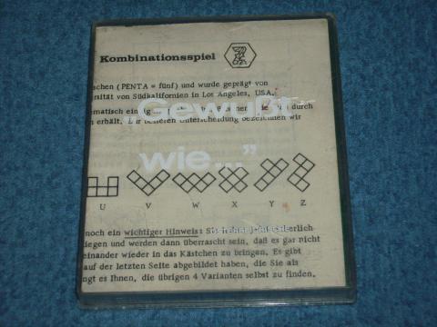 Legespiel mit allen möglichen Pentominos, zweisprachige Ausgabe deutsch/englisch, Parallel- bzw. Nachentwicklung zu Pan-kai. Die Regel enthält Aufgabenstellungen und Lösungen. In klarer Plastikdose mit aufschrift „Gewußt wie…?“ „Österreichische“ Rest nicht mehr lesbar, vermutlich Werbespiel, Firmenangaben aus Regel