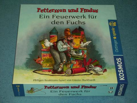 Der Fuchs ist da und hat es auf die Hühner abgesehen, die Spieler sollen ein Feuerwerk zünden, um ihn zu vertreiben. Jeder hat verdeckt ein 6-Teile-Puzzle mit farbiger Rückseite vor sich liegen und eine Holzkugel in der Farbe der Rückseite. Wer dran ist, deckt eines der verdeckt ausliegenden Kärtchen auf. Erscheint der Fuchs, werfen alle Spieler schnellstmöglich ihre Holzkugel in den Becher und rufen Peng. Die beiden schnellsten Spieler dürfen ein Puzzle-Teil aufdecken und ablegen. Der Becher ist so ausgelegt, dass 2 Kugeln nicht nebeneinander Platz haben, man kann genau die Reihenfolge des Einwerfens sehen, wer am schnellsten war, dessen Kugel liegt ganz unten. Erscheint ein Huhn, wird gesucht, ob es ein zweites gleiches gibt. Wenn ja, müssen wieder die Kugeln geworfen werden. Wer am schnellsten ist zeigt die beiden identischen Hühnerkarten und die beiden schnellsten Werfer dürfen ein Puzzleteil aufdecken. Wer falschen Alarm auslöst und eine Kugel wirft, obwohl weder Fuchs noch identisches Hühnermotiv zu sehen sind, muss ein schon aufgedecktes Puzzleteil wieder verdecken. Nach der Raketenzündung gehen das Hühnerpaar oder der Fuchs vom Spielplan. Wer zuerst sein Puzzle fertig hat, hat gewonnen. Ein Feuerwerk für den Fuchs bietet eine sehr hübsche Kombination von Mechanismen, das Klacken der Kugeln im Becher und die Geräusche von den Kindern imitieren tatsächlich ganz brauchbar ein Feuerwerk und auch die Punktewertung in Form eines Puzzles funktioniert sehr gut. Das Ganze passt auch wunderbar zum Buch, und wer es gelesen hat wird mit Vergnügen beim Spielen daran denken.