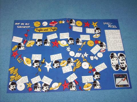 Lauf/Würfelspiel, mit Ereignisfeldern, Ereignisse aussetzten, vorrücken, zurückgehen, noch einmal würfeln, etc Im Regeltext Hinweis auf die Single „Auf in die Galaxien“ von Piefke und Pafke, eine Abbildung in der Ecke des Plans könnte die Single darstellen