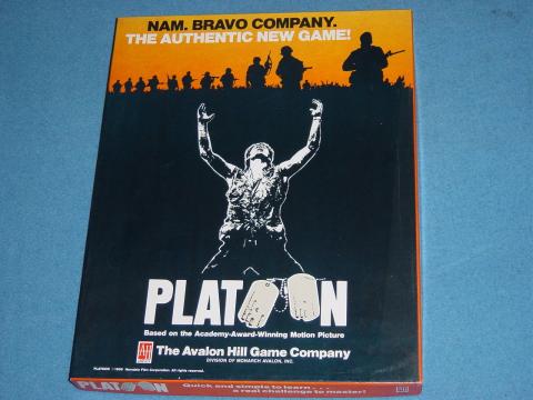 Platoon Cosim auf Basis des Vietnamkriegs und des gleichnamigen Films, ein Spieler verkörpert USA, der andere Vietnam, es sind vier verschiedene Spiele möglich, die Regeln folgen im großen und ganzen denen aller anderen Cosims für 2 Spieler. Ludografische Angaben Verlage: Avalon Hill Inventarnummer: 298 Kategorien: 2-Personen, Konflikt/Simulation Erscheinungsjahr 1987 Spieler 2 - 2 Spieler Alter 15 - 99 Jahren Dauer bis 120 Minuten