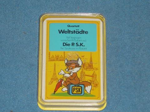 Quartett Weltstädte 8 x 4 Karten, zusammengefasst nach Regionen - Westeuropa, Mitteleuropa, Südeuropa, Osteuropa, Nordamerika, Südamerika, Ferner Osten, Südasien. Ludografische Angaben Verlage: PSK Inventarnummer: 14099 Kategorien: Karten, Sammeln Spieler 8 - 2 Spieler Alter 7 - 99 Jahren Dauer bis 20 Minuten