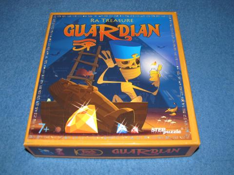 Der Bewacher des Schatzes von Ra wird von den Spielern gestört, die ihrerseits Schätze sammeln sollen. Jeder Spieler bekommt eine Figur, Karte mit Held und 14 Karten, die er mischt und stapelt. Je nach Spieleranzahl kommen Bewacherkarten ins Spiel. Artefakte und der Diamantmarker der Runde wird bereitgelegt. Ein Spieler spielt auch für den Bewacher. Für einen Zug werden zuerst die Schritte des Bewachers gewürfelt. Dann wählt man eine seiner Handkarten – diese werden vom eigenen Stapel gezogen - aus und legt sie aus. Dann wird noch die oberste Guardian Karte gezogen und ausgelegt. Nun werden die Karten verglichen. Der Spieler mit der gleichen Farbe wie die Guardian-Karte ist der ausgewählte Spieler der Runde; alle anderen Spieler ziehen so viele Schritte wie ihre Karte angibt. Dann werden die Guardian Karte und die Karte des ausgewählten Spielers verglichen – bei gleichem Wert bleiben beide stehen, ansonsten zieht, wer den höheren Wert hat, der Guardian die Summe beider Karten, der Spieler die Differenz. Der Guardian bewegt sich immer nach allen Spieler-Figuren. Auf Skarabäenfeldern bekommt man Artefakte. Muss ein Spieler dort stehen bleiben, kann man nächste Runde noch ein Artefakt nehmen. Erreicht der Wächter das Feld „Ausgang“ der Pyramide, müssen die in der Pyramide verbliebenen Spieler ihre Artefakte zurückgeben. Nach vier solchen Runden gewinnt man mit den meisten Punkten. Ein netter Ansatz für ein Familienspiel, vor allem die Wächter-Funktion ist gut gelöst; Material und Grafik sind nett, die Regel allerdings lässt das ganze wie einen Prototyp wirken, daran muss noch gearbeitet werden.