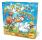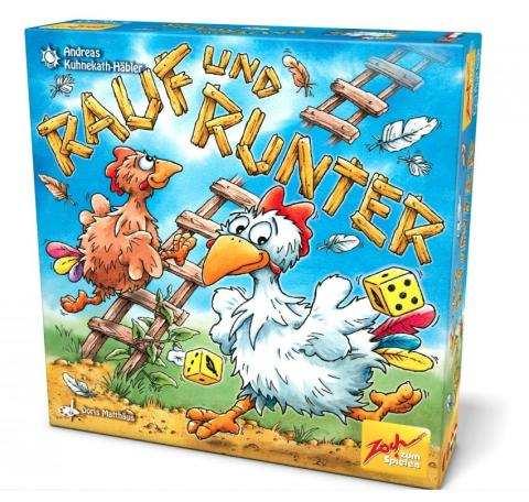 Rauf auf der Hühnerleiter und zwar höher als die anderen! 7 Zahlen-Karten liegen längs der Leiterkarten, die erste Karte zeigt die Flatterzahl der Runde! Die Pistenhühnchen sitzen am Start ihrer Pisten, die Leiterhennen am Startfeld der Leiter. Man würfelt 5x pro Zug und legt nach jedem Wurf einen Würfel weg, entweder für eine Feder oder Einsetzen des Würfels nach genauen Regeln auf der Piste oder Verwerfen auf den Misthaufen. Wurde nach 5 Würfen die Flatterzahl nicht überschritten, setzt man sein Pistenhuhn zum letzten Würfel. Mit Federn kann man zu hohe Werte reduzieren; kann oder will man das nicht, zieht die Leiter-Henne um die Differenz zur Flatterzahl rückwärts. Am Ende der Runde bewegen diejenige ihre Leiterhennen, die das Pistenhuhn auf dem geringsten Wert übertroffen haben; das oder die Pistenhühner in letzter Position erhalten je 2 Federn. Dann verlängert die Flatterzahl-Karte die Leiter und die nächste Karte zeigt die neue Flatterzahl.