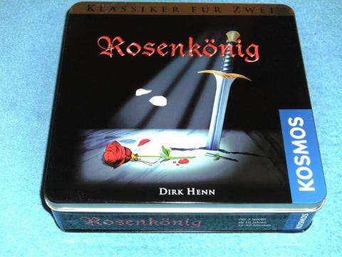 York gegen Lancaster um die Macht in England zwischen 1455 und 1485, War of the Roses, die Rosenkriege der weißen Rose im Wappen Yorks gegen die rote Rose im Wappen Lancasters, die Spieler kontrollieren eines der Häuser und versuchen, möglichst viel Fläche zu kontrollieren. Das umkämpfte Land wird durch ein 9x9 Raster dargestellt, auf dem Zentralfeld mit der Windrose steht der Spielstein in Form einer Krone. Die Spieler bewegen diese Krone durch Ausspielen von Machtkarten und markieren das jeweils erreichte Feld mit einem Machtstein der eigenen Farbe. Die Machtkarten geben mögliche Zuchtrichtung und Zugweite an, jeder hat fünf Karten offen ausliegen. Man kann nun eine Karte spielen und die Krone bewegen, die Bewegung muss komplett über freie Felder ausgeführt werden. Stattdessen kann man nachziehen bis man fünf Karten besitzt oder auch eine Machtkarte mit einer Heldenkarte spielen und so einen generischen Stein zu vertreiben. Man muss einen Zug machen, außer es geht gar nichts. Kann niemand ziehen oder nachziehen oder sind alle Machtsteine verbraucht, endet das Spiel. Dann zählen beide ihre Gebiete aus Feldern, die über eine Seite miteinander verbunden sind, ein Gebiet ist Felderanzahl² wert, man addiert die Werte, wer die meisten Punkte hat, gewinnt. Trotz minimaler Regeln ein hochtaktisches Spiel, alle Informationen liegen offen und man kann etwas planen, trotz des Zufallsfaktors Karten nachziehen. Für mich nach Lost Cities das beste Spiel der Serie von Zweierspielen bei Kosmos, das zu Recht eine Neuauflage in der Blechdose bekommen hat.