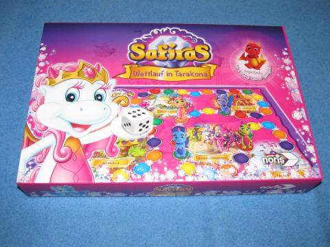 Safiras sind Elementdrachen, die in Tarakona leben, es gibt Erddrachen, Wasserdrachen, Luftdrachen und Feuerdrachen und leider auch den bösen kleinen Schattendrachen Draki. Die Drachen beziehen ihre Kraft aus ihren Element-Edelsteinen. In diesem Drachenwettlauf möchte man seinen Drachen schnellstmöglich ins Ziel bringen. Für die Grundversion des Spiels legt man den Spielplan mit Wegen ohne Abkürzungen und Symbole auf den Feldern aus; jeder hat einen Drachen. Man würfelt den Farbwürfel und zieht zum nächsten freien Feld der Farbe. In Variante 2 spielt man wie in Variante 1, aber mit Zahlenwürfel; ist das Zielfeld besetzt, zieht man auf das nächste freie Feld. Variante 3 wird auf der Planseite mit Wegvarianten und Symbolen auf den Feldern gespielt. Man wirf beide Würfel, wählt einen und zieht seinen Drachen entsprechend. Den anderen Würfel verschenkt man an einen Mitspieler, der nun seinen Drachen entsprechend bewegen kann. Symbole auf den Feldern bringen Ereignisse: Auf „Abkürzung“ geht man in die für den verwendeten Würfel angegebene Richtung; „Drei Farben“ – man muss den Farbwürfel wählen. „Sechs Farben“ – man bleibt stehen, wenn man den Farbwürfel wählt oder geschenkt bekommt. „Vorsprung“ – erreicht man dieses Feld, zieht man die angegebene Anzahl Felder weiter. „Nochmals Würfeln“ – wer diese Felder erreicht, darf mit dem abgebildeten Würfel noch einmal würfeln und seinen Drachen ziehen. Es gewinnt immer, wer zuerst im Farbenreich ankommt. Das grundlegende Thema der Safiras Drachen-Sammelfiguren ist Freundschaft, wie in diesem Spiel durch das Verschenken der Würfel umgesetzt, ansonsten gibt es einfachste Mechanismen in allen drei Varianten.