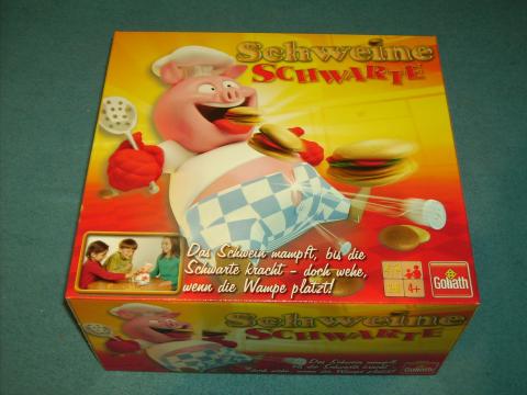Die Spieler füttern das Schweinchen mit Hamburgern und helfen beim Kauen, aber das Schweinchen überfrisst sich und platzt. Das Schweinchen wird vorbereitet: Aus der Rückenklappe nimmt man die Hamburger, drückt das Schweineschwänzchen nach links und lässt so die Luft entweichen. Die beiden Arme werden bis zum Klick hinuntergedrückt. Der Gürtel wird mit der Schnalle geschlossen und die Weste passend angedrückt. Nun kann das Füttern beginnen. Die Hamburger liegen Zahlenseite nach unten auf dem Tisch. Man würfelt, nimmt den Hamburger der erwürfelten Farbe und zeigt allen Mitspielern die Zahl auf dem Hamburger. Dann füttert man das Schweinchen damit und drückt sooft auf die Kochmütze, wie die Zahl am Hamburger verlangt hat. Wer eine Farbe würfelt, in der es keinen Hamburger mehr gibt, braucht keinen verfüttern. Und auch wer den durchgestrichenen Hamburger würfelt, ist diese Runde nicht zum Füttern dran. Wenn das Schweinchen beim Füttern platzt, scheidet der Spieler aus, der es gefüttert hat. Dann wird das Schweinchen wieder vorbereitet und die restlichen Spieler spielen eine neue Runde. Wer als Letzter im Spiel ist, gewinnt. Das Thema ist vielleicht nicht unbedingt jedermanns Sache, aber Teil unseres Alltags, Schweine werden gemästet, und offensichtlich macht das Spiel Erwachsenen genauso viel Spaß wie der eigentlichen Zielgruppe Vorschulkinder, denn das Spiel hat die Auszeichnung Top10Spielzeug 2008 bekommen. Die Umsetzung des Themas ist jedenfalls gelungen, die Regeln sind einfach und die Mechanik faszinierend.