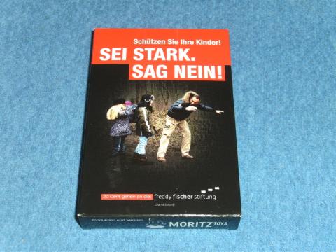 Gewalt gegen Kinder, Gefahr für Kinder - Thema dieses Gewaltpräventionsspiels für die ganze Familie mit dem Ziel, Kinder spielerisch für den Umgang mit fremden Personen zu sensibilisieren. Im Spiel sind drei Arten von Karten, rote Präventionskarten, grüne „Zeige was“ Karten und blaue „Merke dir was“-Karten. Die Karten werden vom Moderator gemischt und gestapelt, dann zieht man eine Karte. Wird die rote Präventionskarte gezogen, zeigt der Moderator das Bild und liest die auf der Rückseite angegebenen Antwortmöglichkeiten vor. Der Spieler wählt eine der Möglichkeiten, es gibt manchmal mehrere richtige Antworten, die Spieler sollen begründen warum sie so geantwortet haben; eventuell kann man diskutieren, richtiges Verhalten erklären etc. Die Gymnastik- und Bewegungsübungen auf den grünen Karten sollen Kraft und Selbstvertrauen vermitteln und die blauen Bildkarten in der Kategorie Merke dir was sollen zu genauem Beobachten und weiterer Folge zum Analysieren anregen. Für richtig beantwortete Fragen und korrekt absolvierte Übungen bekommt man die Karte und damit einen Punkt; wer die meisten Punkte hat, gewinnt. Dieses Kartenspiel greift wohl eines der wichtigsten Themen im Umgang mit Kindern auf; es vermittelt den Kindern eine Gefühl für potentiell gefährliche Situationen ohne Angst zu machen und zeigt, dass es in Ordnung ist, Nein zu sagen, wann immer einem eine Situation missfällt oder nicht geheuer ist. Der Schwerpunkt liegt auf den Präventionsthemen und da ausschließlich auf Gewalt, die Kindern außer Haus begegnen kann, der Bereich häusliche Gewalt wurde ausgeklammert.