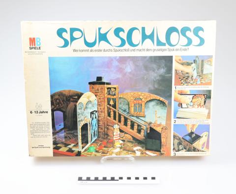 In diesem Spiel, das neben dem klassischen Brettspieldesign über einen 3-D-Aufbau verfügt, geht es darum, bis zu vier Spieler durch ein Schloss zu führen, in dem es nicht geheuer ist. Das Gemäuer ist unterteilt in vier Räume, die die klangvollen Namen "Wimmer-Zimmer", "Qual-Saal", "Jammer-Kammer" und "Traum-Raum" (mein persönlicher Favorit) tragen und mit verschiedenen Fallen gespickt sind, die die Mitspieler immer wieder behindern. Aufgrund seiner "Interaktivität" ist ein ruhiger "Reihum-Spielfluss" nicht unbedingt möglich, weil man doch geraume Zeit damit verbringt, wieder Ordnung zu schaffen (Spielfiguren und Fallen wieder aufstellen); auch von den Abmessungen der Spielfläche her wird es schnell etwas drängelig. Jedoch unbedingt im Gedächtnis geblieben ist das Design des Spieles, das in mancher kindlichen Erinnerung als recht gruselig verblieben ist. Nachfolgend gibt es einige Bilder von diesem Spiel, dem 1985 unter gleichem Titel und vom selben Hersteller eine modifizierte Version folgte.