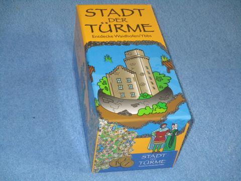 Die Stadt wird aus konzentrischen Kreisen in verschiedenen Rückseitenfarben ausgelegt - eine blaue Insel in der Mitte, gefolgt vom orangen Stadtring, dem gelben Turm/Mauerring und dem grünen Umlandring. Man wählt eine Figur und einen Stadtturm als Startfeld. Man würfelt und zieht entsprechend; auf einem gelben Feld zieht und befolgt man eine Aktionskarte. Anstatt zu würfeln und eventuell eine Karte abzuwickeln, kann man im Umlandring eine Kachel drehen um Wege zu verändern. Hat man im Umlandring 10 Gold gesammelt, bekommt man Zugang zum Stadtring, wo man wieder 10 Münzen sammeln muss, um Zugang zur Insel zu bekommen. Wer sie als Erster erreicht, gewinnt. Werbespiel für Waidhofen / Ybbs