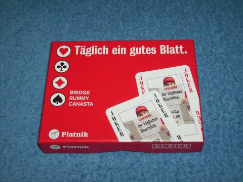 2x 54 Karten für Bridge, Rummy oder Canasta Pik As as Deckblatt, im mittleren Symbol Jockey Logo, darunter Piatnik Vienna Rückseite rot in weißem Rahmen, mit Kurierlogo Cover mit Spielkartensymbolen, Jockeylogo und Schriftzug Piatnik