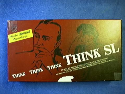 THINK SL Wissensspiel mit fünf Fragen-Gebieten, durch Sticker "mit der thera-med Masterfrage" als Werbespiel gekennzeichnet Ludografische Angaben Verlage: delphi Spiele GmbH Inventarnummer: 10543 Kategorien: Familie, Quiz, Werbe Erscheinungsjahr 1989 Spieler 1 - 16 Spieler Alter 16 - 99 Jahren Dauer bis 45 Minuten