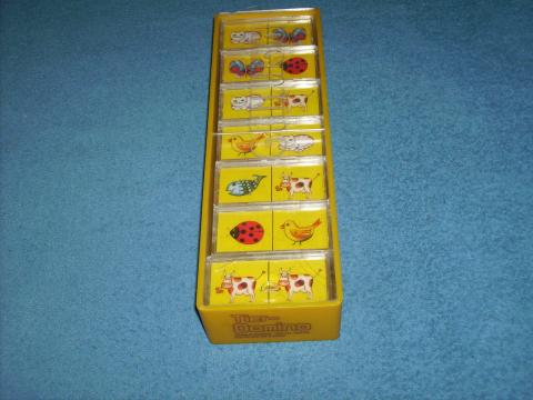 28 große Plastik-Steine mit Tiermotiven, auf der Rückseite Zahlen als kleine farbige Quadrate, in langer schmaler hoher Plastikdose, am Klarsichschuber „Domino“, keinerlei Firmenbezeichnung, nur an Artikelnummer als Peri-Spiel erkennbar