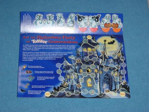 Toffifee Geisterschloss-Spiel Lauf- Würfelspiel mit Halloween-Thema, Spielfiguren zum Ausschneiden und Zusammenkleben beigefügt, Mechanismus Laufspiel mit Ereignisfeldern Als Verpackungshülle für die 48-Stück-Packung Toffifee. Ludografische Angaben Verlage: Storck Inventarnummer: 14059 Kategorien: Figuren bewegen, Laufspiel, Würfel Erscheinungsjahr 2003 Spieler 2 - 4 Spieler Alter 6 - 99 Jahren Dauer bis 29 Minuten