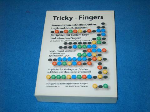 14 Vorlagekarten werden der Reihe nach aufgedeckt und jeder Spieler versucht in seiner Box das Muster nachzubilden. Dazu bewegt er die Kugeln mit den Fingerspitzen. Wer es zuerst schafft, bekommt die Karte, am Ende gewinnt der Spieler mit den meisten Karten. Mit Regeln in Deutsch, Englisch und Französisch. Auf der Regel Logo von Kod Kod International Games, verlegt in der Schweiz von ZumBeiSpiel