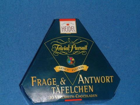 Trivial Pursuit - Genus Edition: Frage & Antwort Täfelchen Frage & Antwort Täfelchen Fragen aus der Genus-Edition auf 30 einzeln verpackten Schokolade-Täfelchen Ludografische Angaben Verlage: CONFISERIE HEIDEL Inventarnummer: 11422 Kategorien: Quiz, Werbe Erscheinungsjahr 1997 Spieler 1 - 4 Spieler Alter 8 - 99 Jahren Dauer bis 30 Minuten