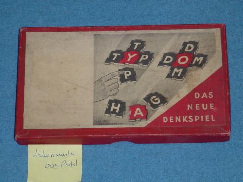 Typ Dom Arbeitsmuster Holzsteine, quadratisch, in rot und blau, mit Buchstaben bedruckt Keine Regel, keine sonstigen Angaben, Arbeitsmuster Erhalten vom Sohn von Franz Weigl, keine sonstige Zuordnung möglich Ludografische Angaben Verlage: WEIGL FRANZ Autoren: Franz Weigl Inventarnummer: 12730 Kategorien: Legen, Abstraktes Spiel Spieler 2 - 4 Spieler Alter 8 - 99 Jahren Dauer bis 25 Minuten