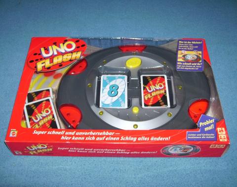 UNO ist neben Scrabble der 2. Klassiker im Programm von Mattel, diese Variante wird mit elektronischer Spielhilfe gespielt. Spielziel ist wie immer, die eigenen Karten als erster loszuwerden. Zu Spielbeginn wird festgelegt, wie schnell gespielt wird. Das Gerät bestimmt nach dem Zufallsspiel, wer gerade dran ist, Innen-Lichter zählen die Zeit herunter, bis der Spielzug abgelaufen ist. Wer seinen Zug verpasst, kann keine Karte ablegen und muss zwei Strafkarten nehmen. Wer die Hau Drauf Karte spielt, muss statt seiner Spielertaste die Hau drauf – Taste drücken, alle anderen müssen schnellstmöglich ihre eigene Spielertaste drücken – der Letzte muss 2 Karten nehmen.