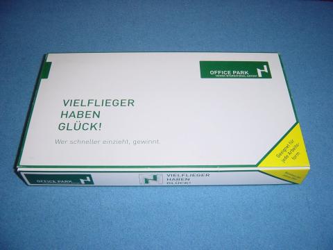 Werbespiel zum neuen Bürohauskomplex am Vienna International Airport, Mechanismus Lauf/Würfelspiel, Variante von Mensch ärgere Dich nicht mit drei Figuren pro Person, bei einer 1 darf man nochmals Würfeln oder eine weitere Figur ins Spiel bringen.