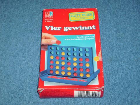 Die Reihenbildung ist eines der ältesten Spielprinzipien. Hier geht es um farbige Scheiben, die aber nicht gelegt werden, sondern von den Spielern abwechselnd in eine Lochwand eingeworfen werden. Wer zuerst vier seiner Scheiben in ununterbrochener Reihe, egal ob waagrecht, senkrecht oder diagonal, bilden kann, hat gewonnen. Ausgabe mit Chipauslöser und Sammelfach