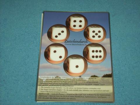 Legespiel mit Würfeln. Jeder Spieler hat eine Karte, die die 6 Augenzahlen eines Würfels zeigt, je nach Spielvariante brauchen die Spieler Würfel und dazu Spielfiguren, Je nach Variante werden die Pöppel bewegt, oder von den erwürfelten Symbolen entfernt.